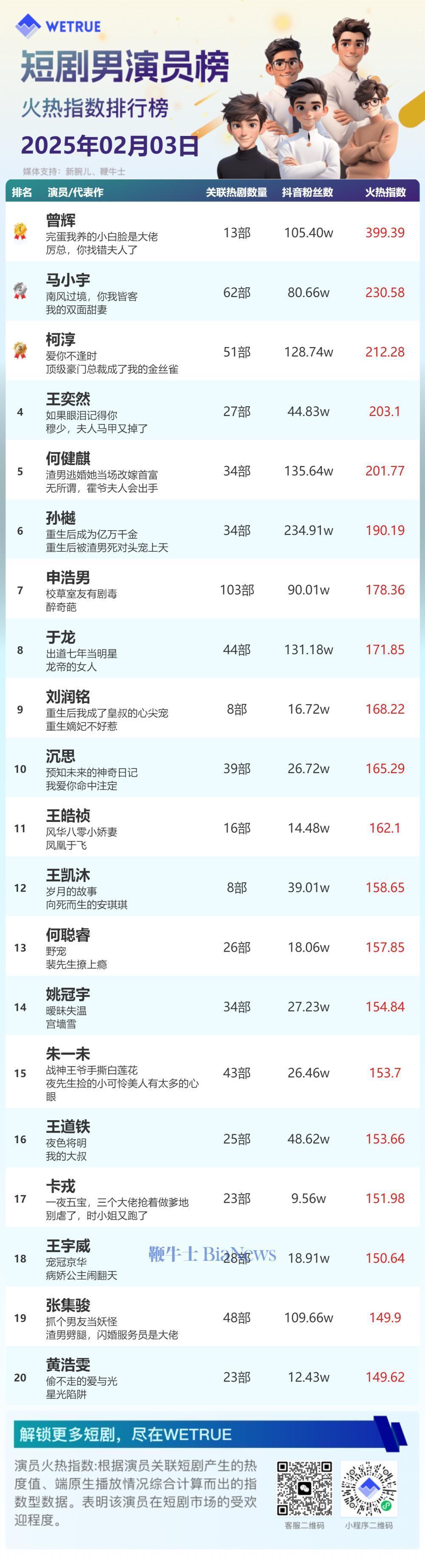 2月4日消息,为帮助短剧从业者提供更多信息,专注于短剧报道的新腕儿和科技媒体鞭牛士联合WETRUE短剧热度榜共同推出多种短剧热度榜。