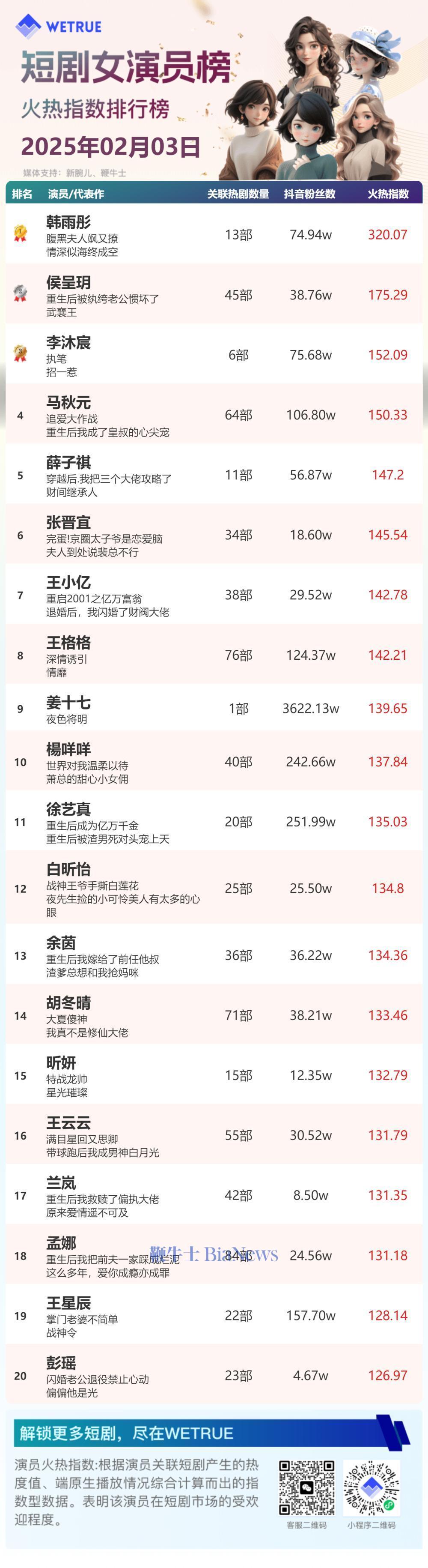 本榜单为短剧女演员&男演员火热指数排行榜。